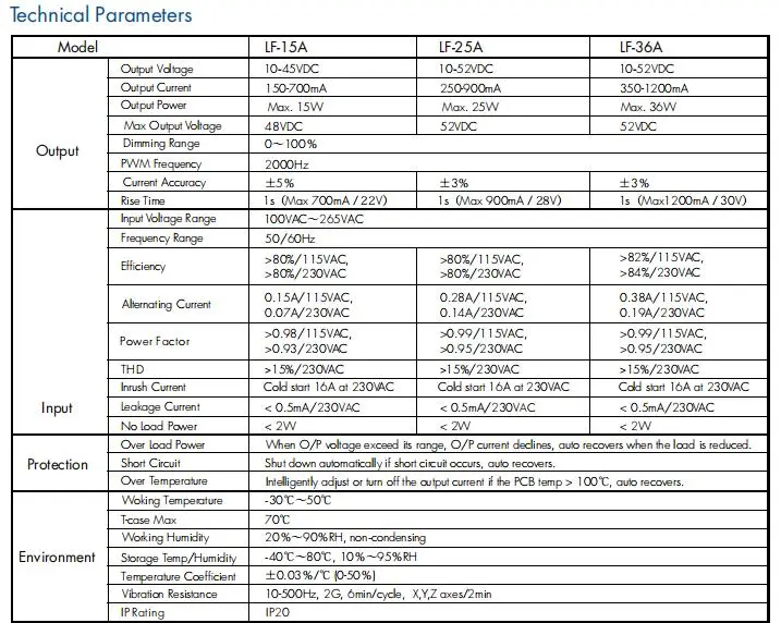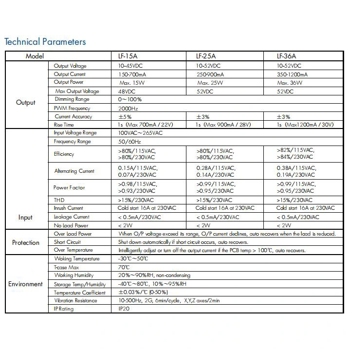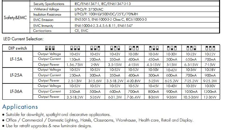 Stabiilne LED-töö: tagab fikseeritud reguleeritud väljundvoolu (nt 700 mA, 1050 mA) laias väljundpinge vahemikus. See on oluline LED-massiivide otseseks juhtimiseks, tagades ühtlase heleduse ja vältides termilist äravoolu.