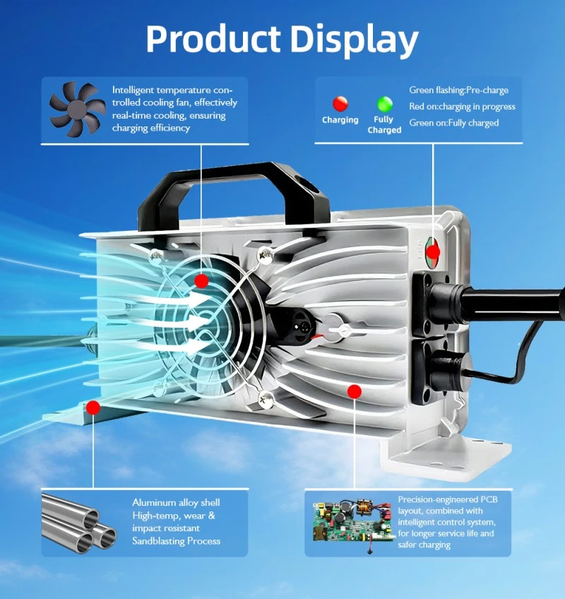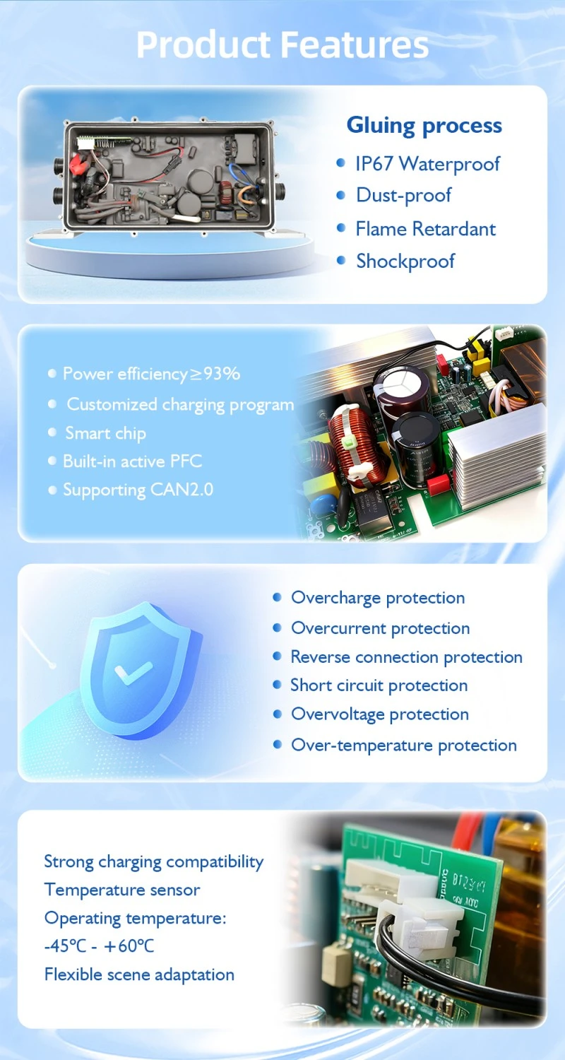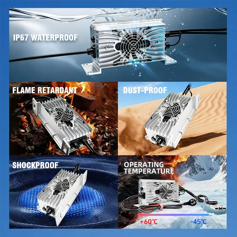 Täisalumiiniumisulamist kest suurendab soojuse hajumise efektiivsust 35% võrreldes plastkestadega, hoides laadija töötemperatuuri alla 60 ℃ pideva 1,2 kW töötamise ajal, kaitstes seeläbi sisemisi komponente ja pikendades kasutusiga. Lisaks on see varustatud mitmekihiliste ohutuskaitsemehhanismidega, sealhulgas ülepingekaitse (max 55 V), ülevoolukaitse (max 28 A), lühisekaitse ja ülekuumenemiskaitse, mis takistab tõhusalt laadija ja aku kahjustamist ning tagab ohutu töö kõigis pardakeskkondades.