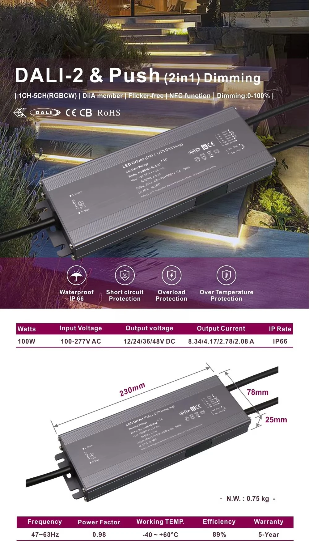 Valige meie 100 W DALI-2 draiver tulevikukindla vundamendi jaoks, mis ühendab nutika juhtimise, tugeva kaitse ja mitmekülgse võimsuse ühes kompaktses ja usaldusväärses seadmes.