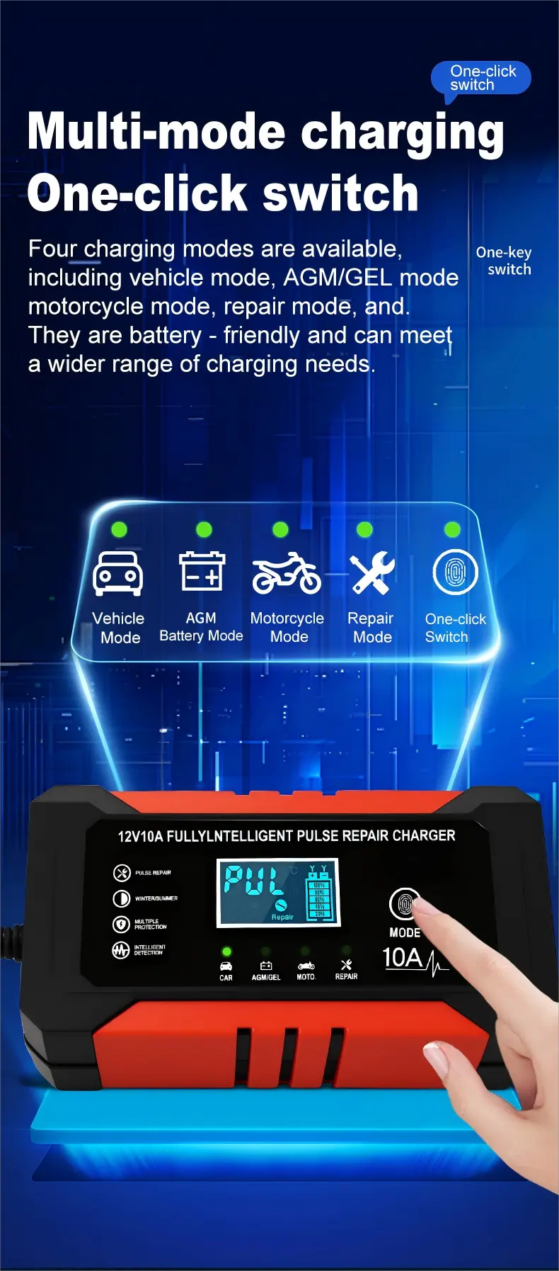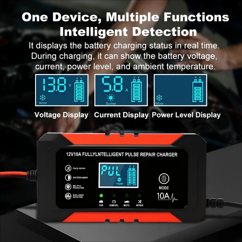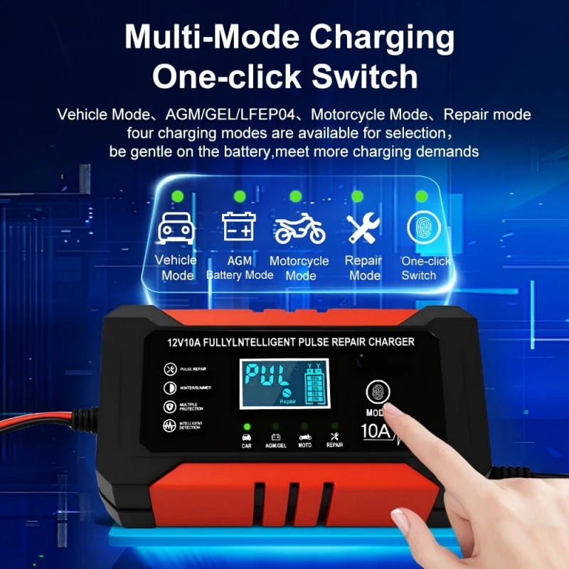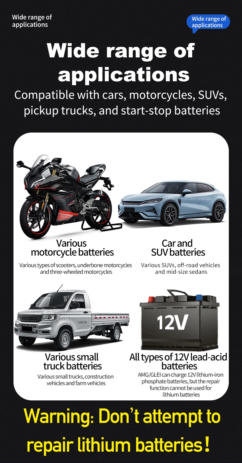 1. Universaalne ühilduvus ja mitme aku tugi: see töötab sujuvalt kõigi 12 V akutüüpidega, sealhulgas plii-happe-, AGM-, geeli- ja LiFePO4-akudega, kattes aku mahutavusega 6Ah kuni 180Ah. 110–230 V lai sisendvahemik kõrvaldab piirkondlikud piirangud, muutes selle kasutatavaks enam kui 100 riigis ja piirkonnas üle maailma.