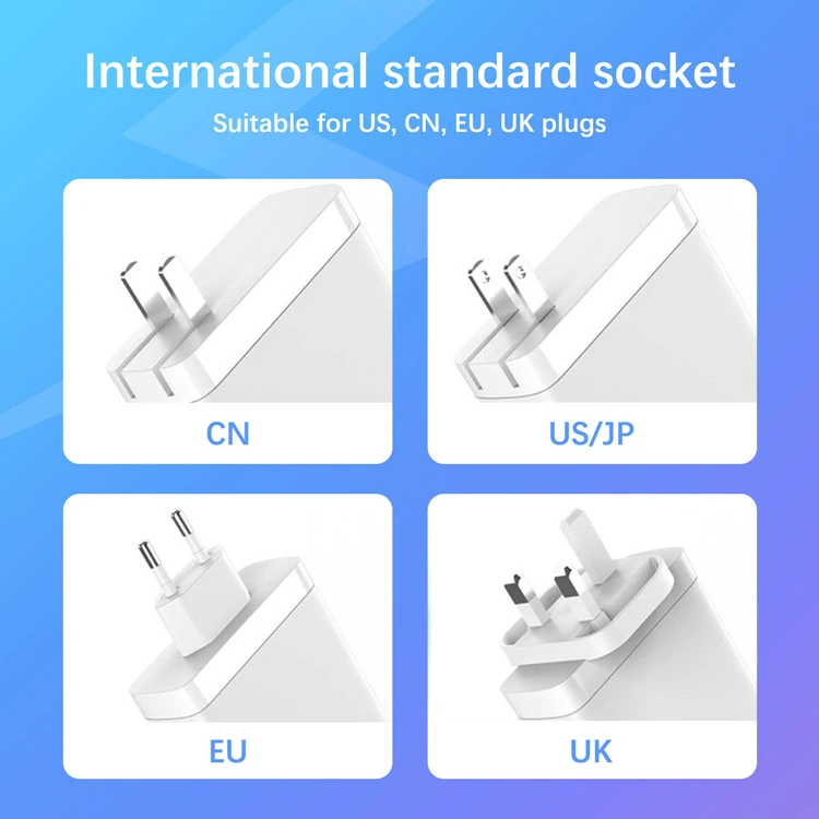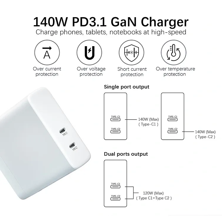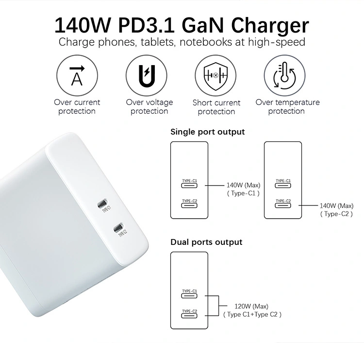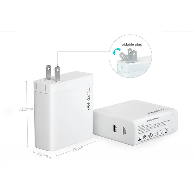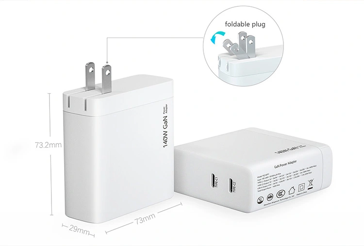 140 W kahe usb c pordiga PD laadija USA pistik kokkupandav: üks port võib pakkuda kuni 140 W võimsust. Kahe pordi väljundvõimsus jaotatakse intelligentselt üheaegselt. Sülearvuti ja mobiiltelefoni samaaegsel laadimisel jääb efektiivsus muutumatuks.