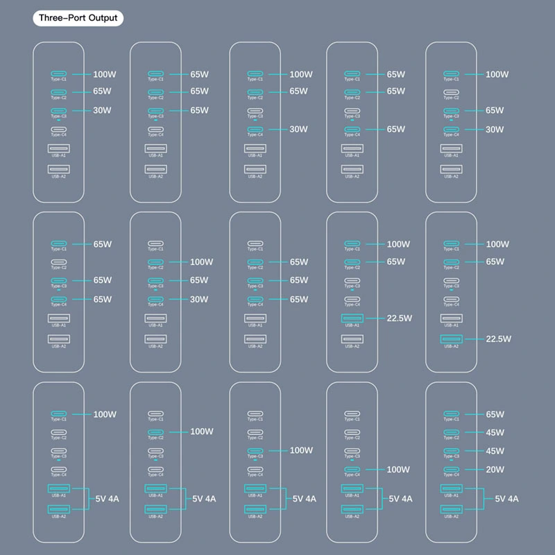 Väljund USB C1/C2/C3/C4: 5V/3A 9V/3A 12V/3A 15V/3A 20V/5A (max 100W) USB A1/A2: 5V/3A 9V/2A 12V/1,5A (max 18W) |