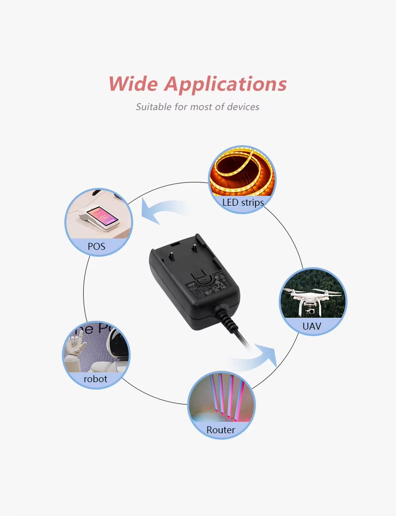 Lai valik rakendusstsenaariume: olgu see LED-valgusribade, nutikate kõlarite, võrguruuterite või muude väikeste elektriseadmete toiteallikaks, see võimas vahetatava pistikuga toiteallikas on teie kõige ideaalsem ja rahustavam valik!