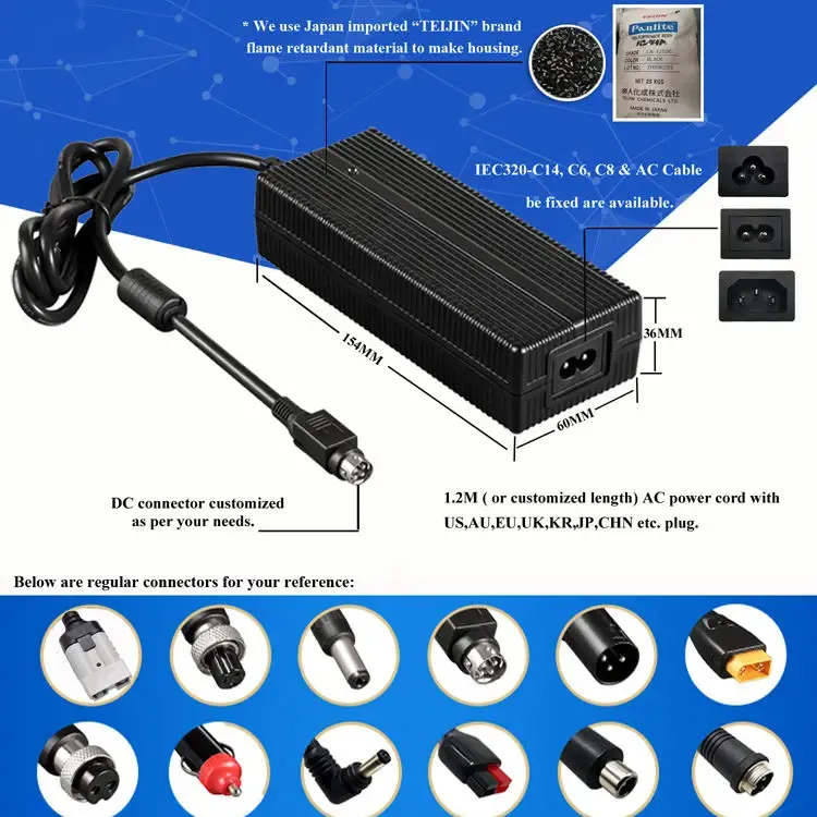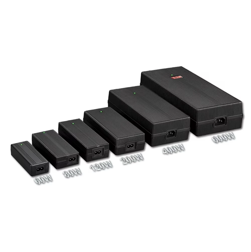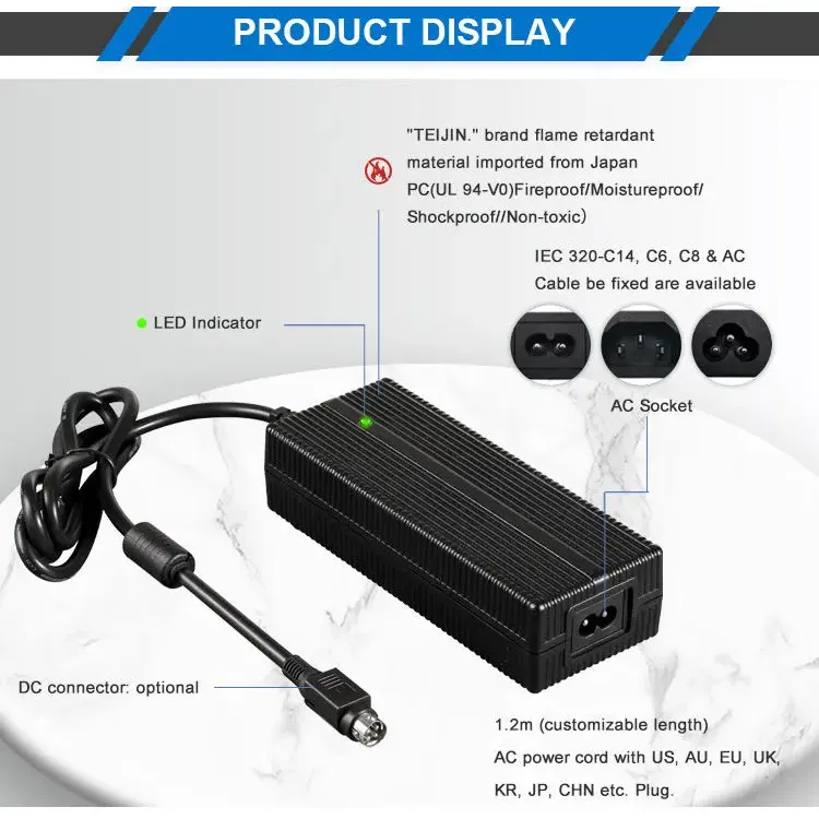 Globaalne ühilduvus ja paindlik disain: See laadija, mis on ehitatud universaalse vahelduvvoolu sisendvahemikuga 100–240 VAC, 50/60 Hz, toetab ülemaailmset kasutamist. Sellel on mitu vahelduvvoolu sisendit (IEC320-C14, C6, C8) ja 1,2 M toitejuhe, mida saab kohandada USA, AU, EL, UK, KR, JP, CHN ja muude piirkondlike pistikutega. Korpus on valmistatud arvuti tulekindlast materjalist, mis tagab vastupidavuse ja ohutuse erinevates töötingimustes.