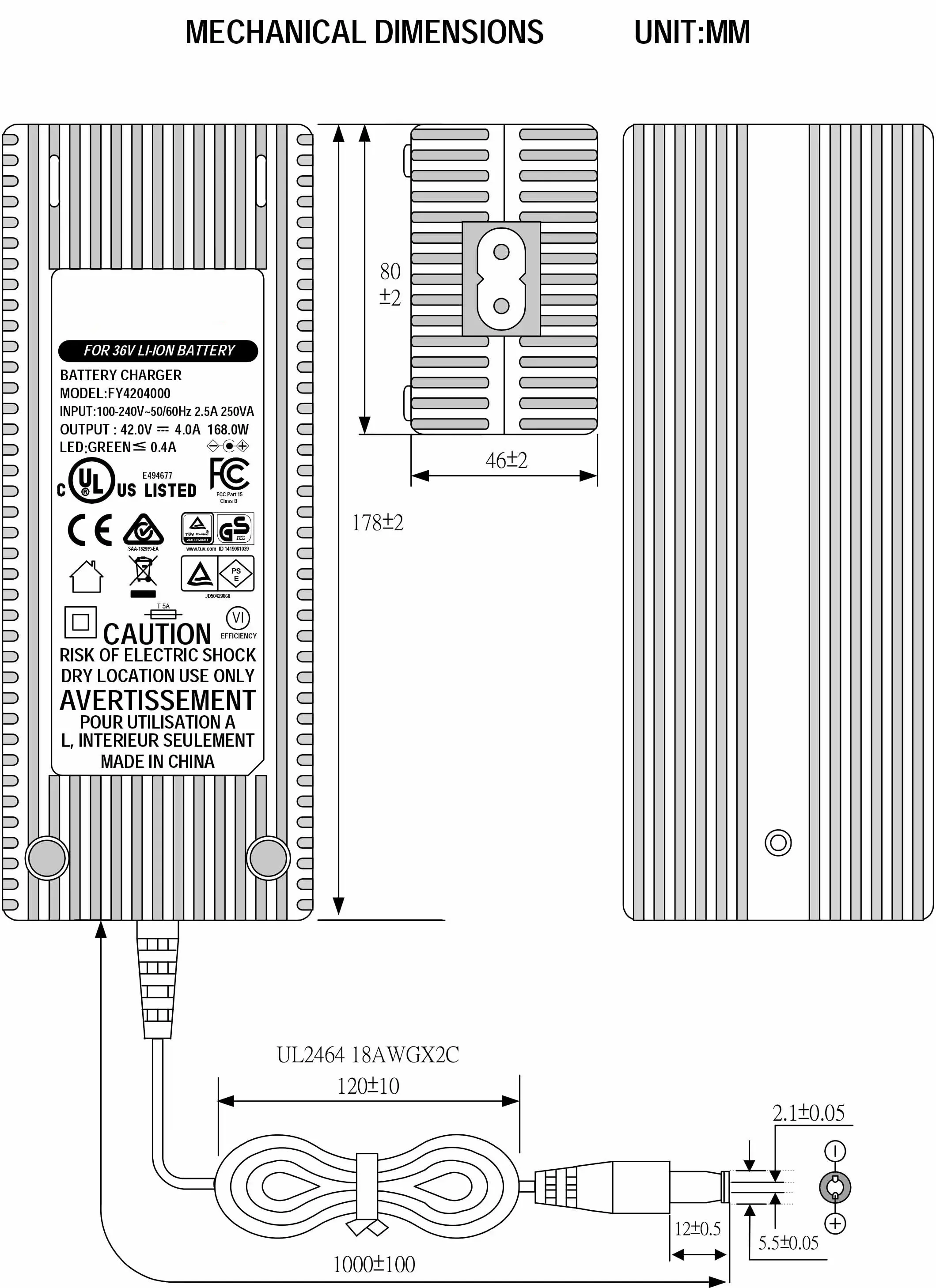 Põhjalik kaitse ja sertifikaadid: Ohutus on esmatähtis. 42 V 4A rolleri akulaadijal on tugevad kaitsemehhanismid, sealhulgas lühise-, ülepinge-, ülekuumenemis- ja ülekoormuskaitse, koos HIPOT-testiga kuni 4200 V, et suurendada isolatsioonikindlust. See töötab tõhusalt >89% efektiivsusega ja omab ulatuslikku ülemaailmsete sertifikaatide loendit: UL, CUL, GS, CE, BS, SAA, KC, PSE, CB, FCC, EMC, ROHS ja REACH, mis vastavad ohutusstandarditele, nagu UL60950, IEC60950 ja IEC600.