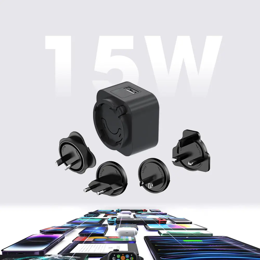 Täielik eemaldatavate pistikute komplekt (US/EL/UK/AU/KR/CN) tagab sujuva kasutamise enam kui 150 riigis – ideaalne rahvusvahelisteks reisideks ja igapäevaseks kasutamiseks.