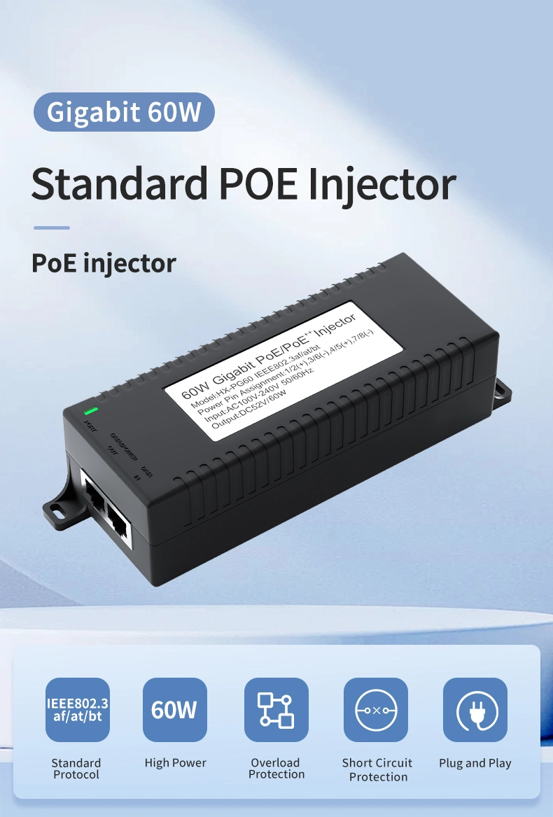 Ostke Hiina professionaalselt PoE-pihustite tootjalt Starwellilt kvaliteetne 60 W lauaarvuti POE-pihusti koos IEEE802.3AF/AT/BT-ga. See järgib rangelt IEEE 802.3af/at/bt rahvusvahelisi standardeid ja on loodud samaaegseks toite ja andmete edastamiseks võrguseadmete Etherneti kaablite kaudu. See toetab kuni 60 W väljundvõimsust ning suudab suurepäraselt mahutada ja juhtida suure võimsusega PoE-toega seadmeid, nagu PTZ-kuppelkaamerad, kõrglahutusega kaamerad, traadita AP-d ja videotelefonid. Pihusti on kompaktse lauaarvuti disainiga ja varustatud otsetoitepistikuga, mis tagab mugavuse ühendamise ilma täiendava konfiguratsiooni vajaduseta. See on varustatud intelligentse vooluahela kaitsemehhanismiga, mis takistab tõhusalt liigvoolu, ülepinget ja lühiseid, tagades terminaliseadmete stabiilse ja ohutu toiteallika erinevates paigalduskeskkondades.