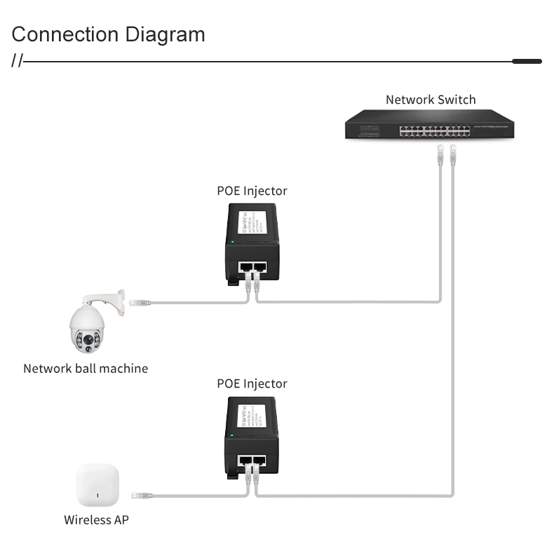 Paindlik rakendus: 60 W Gigabit Active PoE splitter IEEE802.3af 1000 Mbps kiirus IP-kaamera jaoks Juhtmevaba AP saab siduda Gigabit PoE splitteriga, et pakkuda toidet mittestandardsetele seadmetele, laiendades seeläbi selle rakendusstsenaariumide valikut.