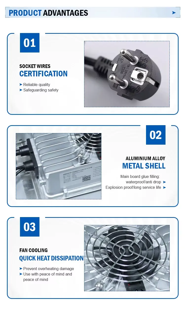 High Efficiency & Smart Protection: See laadija, saavutades kuni 93% efektiivsuse ja võimsusteguri ≥0,98, minimeerib energiakadu ja vähendab kasutuskulusid. Sisseehitatud kaitsed hõlmavad ülepinge, lühise, vastupidise polaarsuse ja ületemperatuuri kaitset. LED-indikaator annab ühe pilguga selge laadimisoleku.