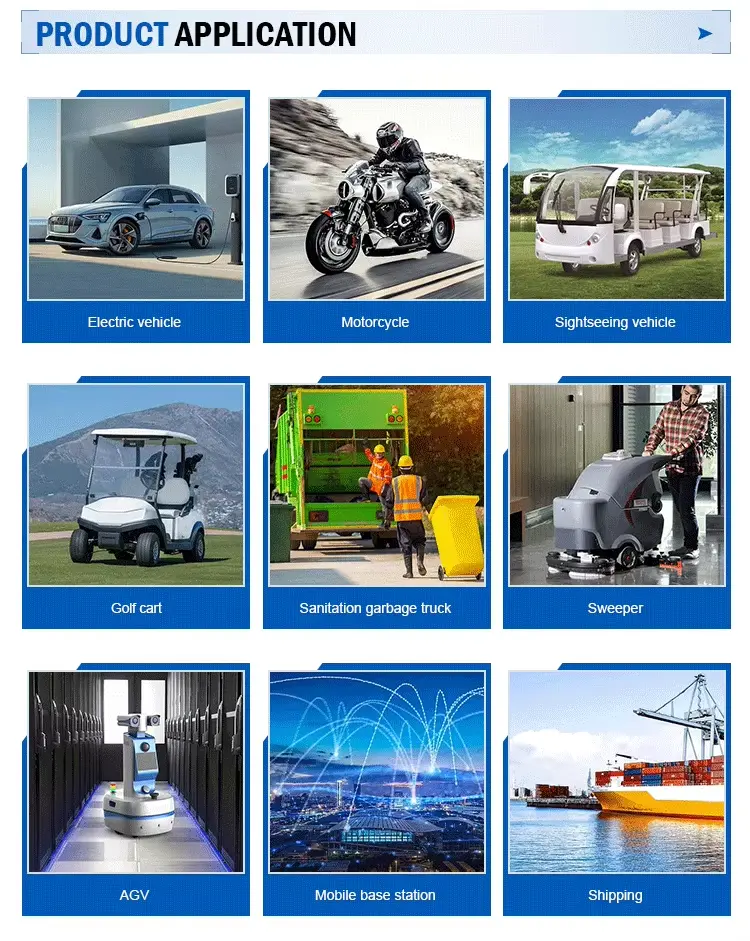 Kasutamine: mootorratas/tõukeratas, kolmerattaline jalgratas, põllumasin, pühkimismasin, tõstuk, veoauto, elektribuss, pliiaku, elektrisõiduk, ekskursioonisõiduk, logistikasõiduk, puhastussõiduk, patrullauto, düünikärud, laev, sideseadmed