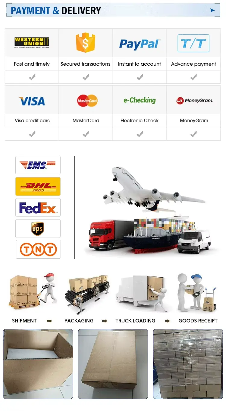 A4: väikesed tellimused saadetakse kiirpostiga (FEDEX, DHL, EMS, TNT). Suured tellimused saadetakse meritsi või õhuga. Saadaval FOB hind. Võite kasutada oma ekspediitorit või meie oma.