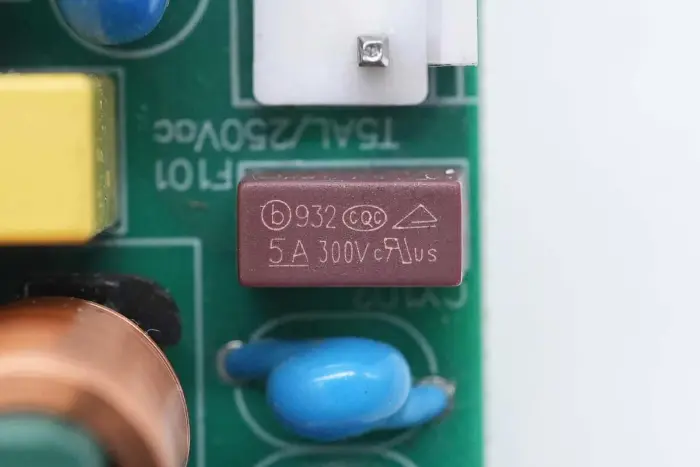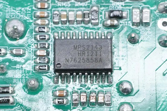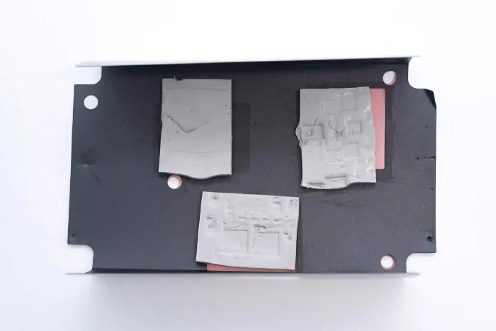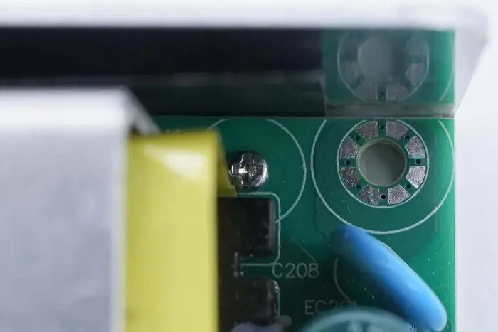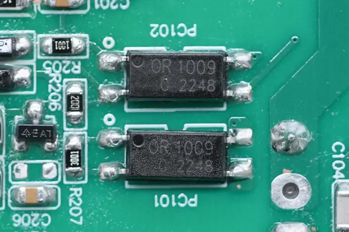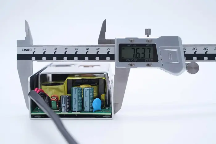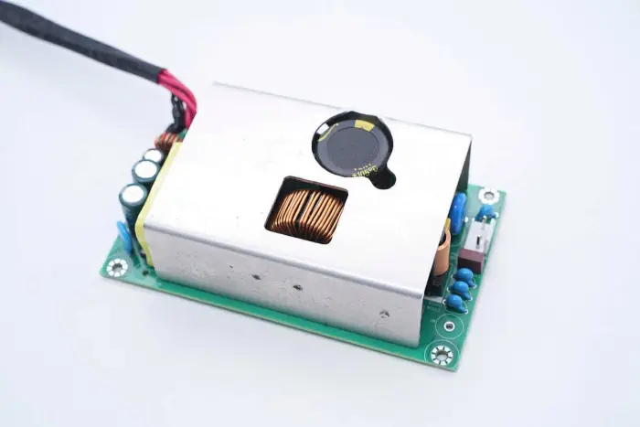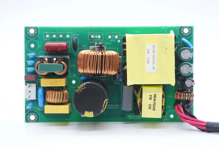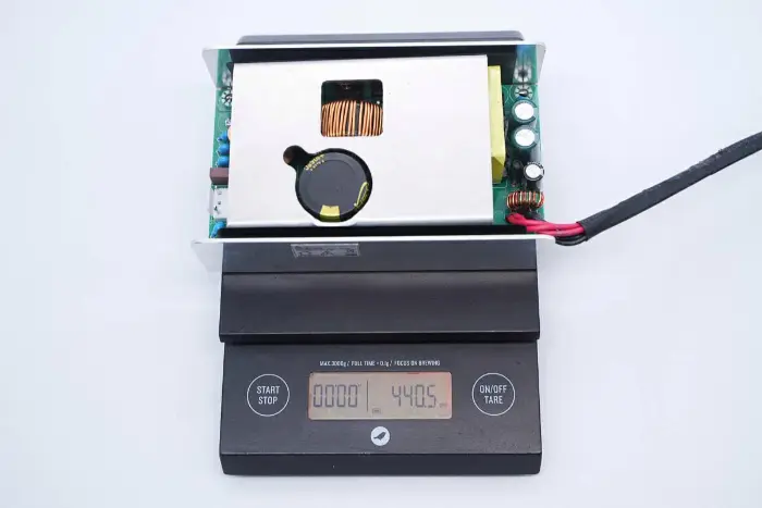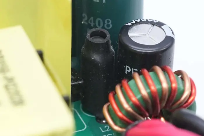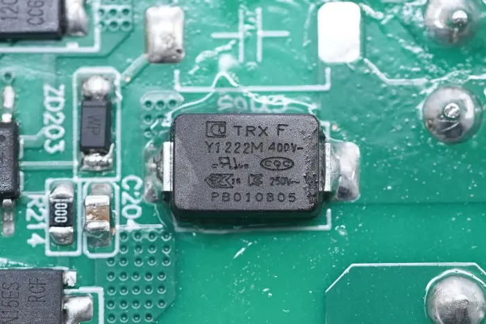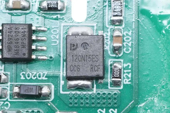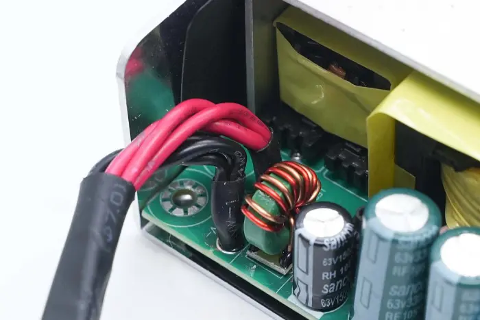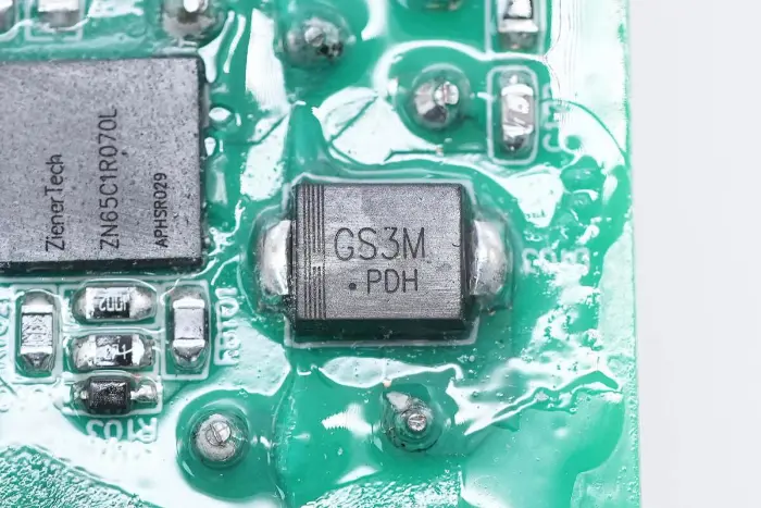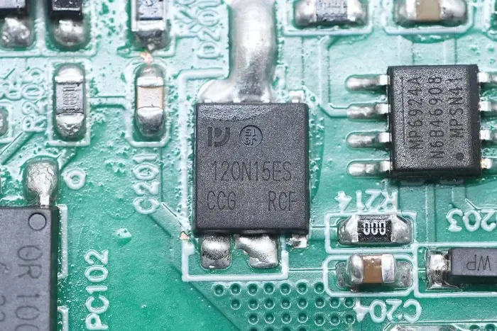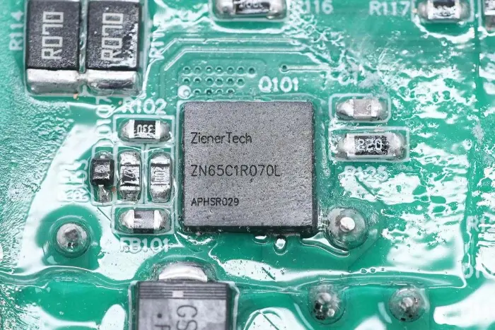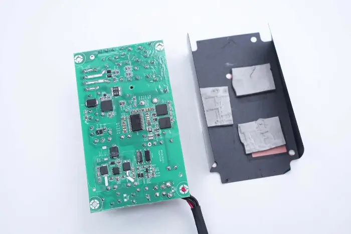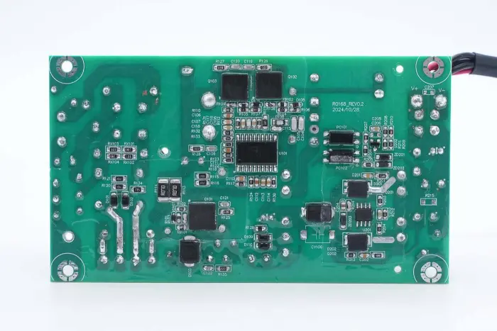 PCBA mooduli tagaküljel on 2-in-1 PFC+LLC kontroller. PFC lüliti asub all vasakul, LLC lüliti on peamise juhtkiibi kohal, tagasiside optroniil on paremal ning sünkroonalaldi kontroller ja kaks sünkroonset alaldit on all. Kogu plaat on kaitseks kaetud konformse kattega.