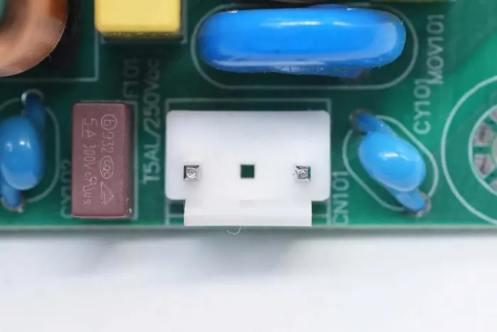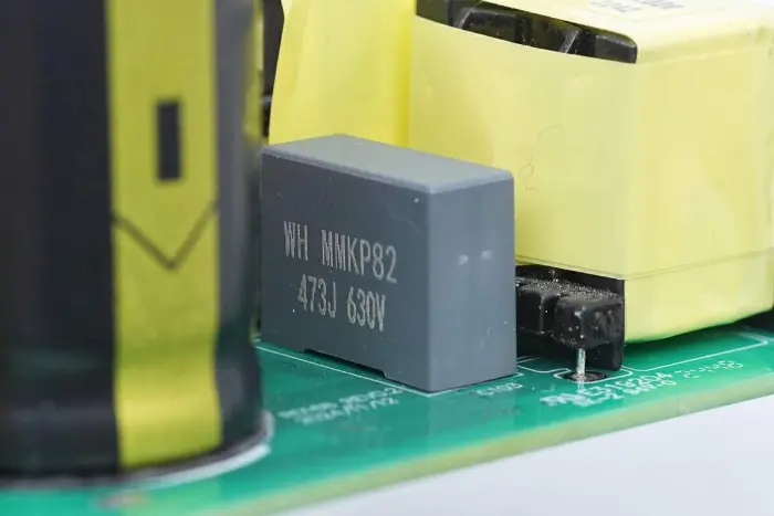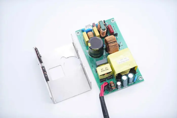 Ülevaade PCBA mooduli esiosast: vasak pool on varustatud toite sisendpesa, kaitsme, Y kondensaatori, varistori, tavarežiimi induktiivpooli ja X2 turvakondensaatoriga. Keskmine asend on varustatud PFC induktiivpooli ja kõrgepingefiltri kondensaatoriga. Parem pool on varustatud LLC resonantskondensaatori, resonantsinduktori, trafo, filtrikondensaatori ja filtri induktiivpooliga.