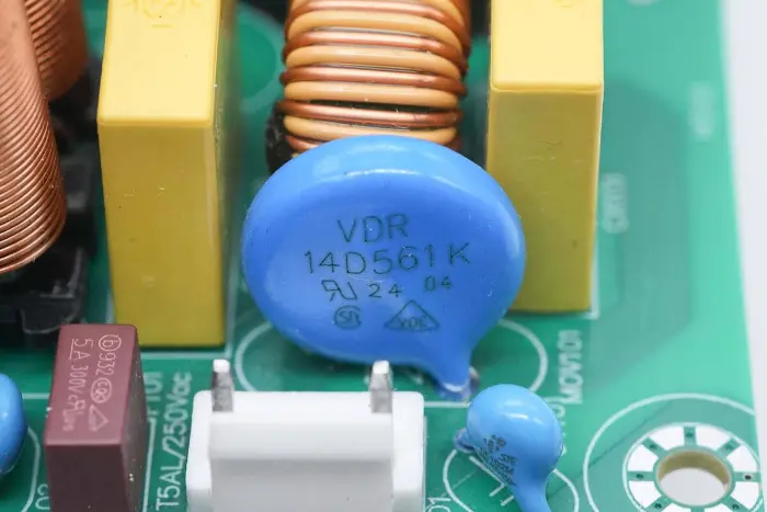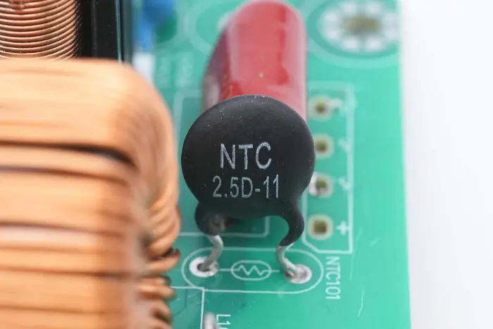 NTC termistor on märgistatud 2.5D-11, mida kasutatakse kõrgepinge elektrolüütkondensaatori laadimisvoolu summutamiseks.