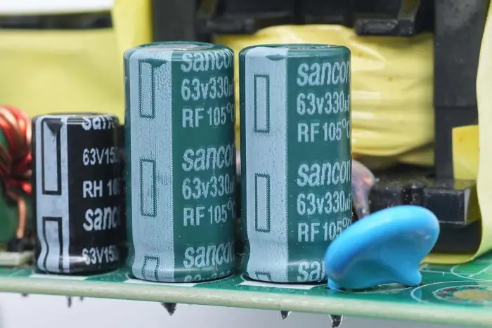 Väljundfiltri kondensaatorid on firmalt Sancon (Nantong Sanxin), RF-seeria pikaealised kondensaatorid, spetsifikatsiooniga 63V 330μF, kaks paralleelselt.