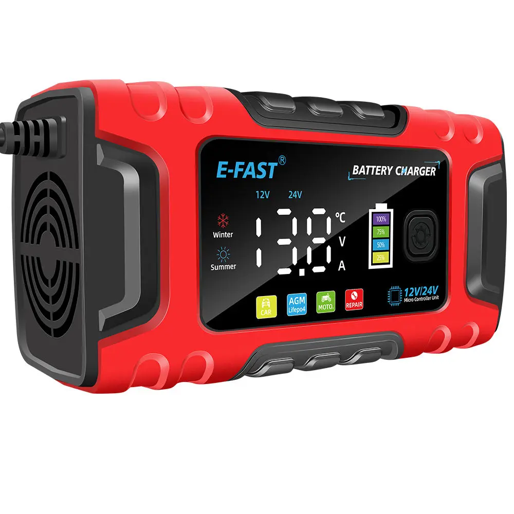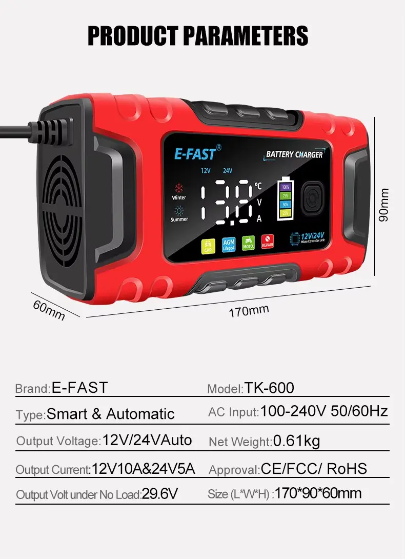 Kvaliteetne E-Fast TK-600 täisautomaatne impulssparandustehnoloogiaga 12V10A 24V5A pliihappe lifepo4 akulaadija autole |