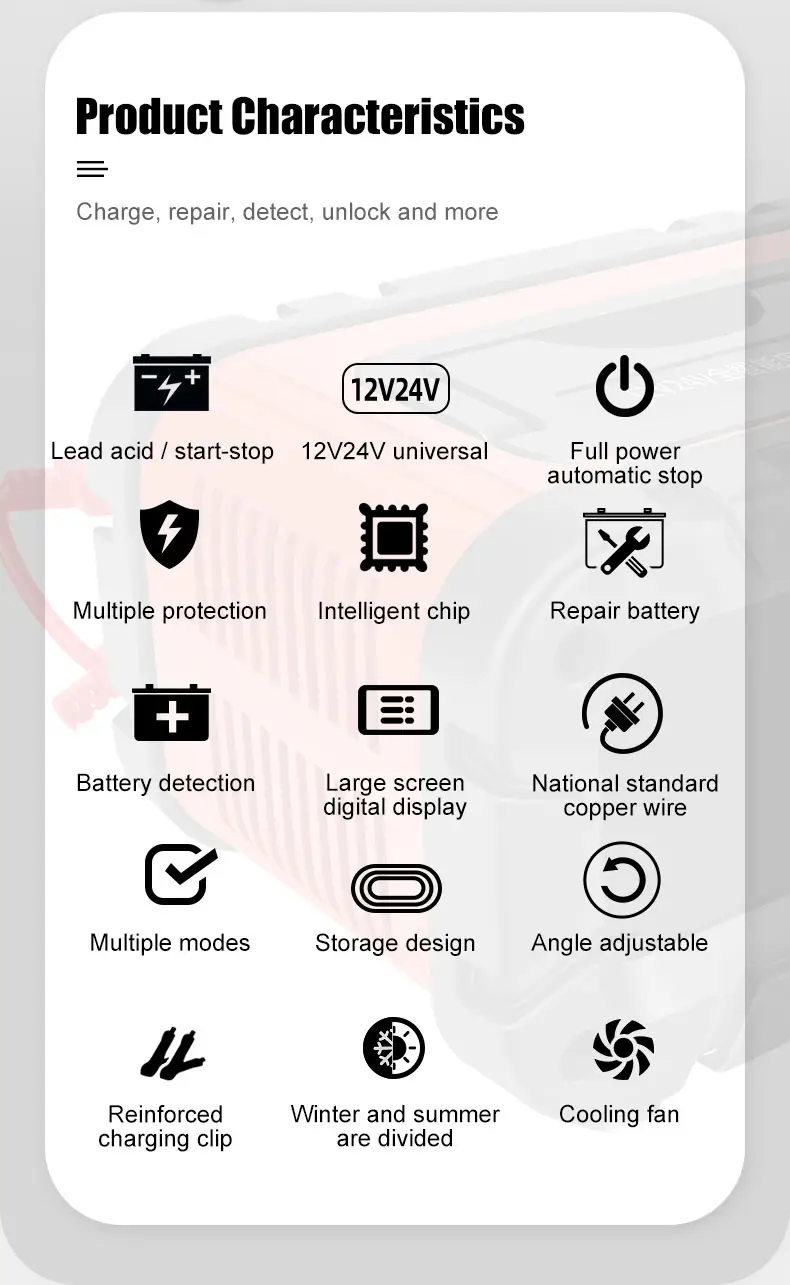 Hiina professionaalse tootja ja tarnija Starwelli universaalne 12 V 24 V pliiakulaadija TK700 on suure jõudlusega intelligentne laadimissüsteem, mis on loodud paljudele pliiakudele. See on loodud auto-, mere-, tööstus- ja avariienergia rakenduste jaoks ning ühendab endas automaatse pingetuvastuse, täiustatud remonditehnoloogia ja stabiilse väljundi juhtimise, et tagada usaldusväärne energia taastamine ja aku pikaajaline hooldus. TK700 universaalne 12 V 24 V pliiakulaadija on loodud pakkuma nii kiiret laadimist kui ka põhjalikku hooldust ühes kompaktses seadmes.