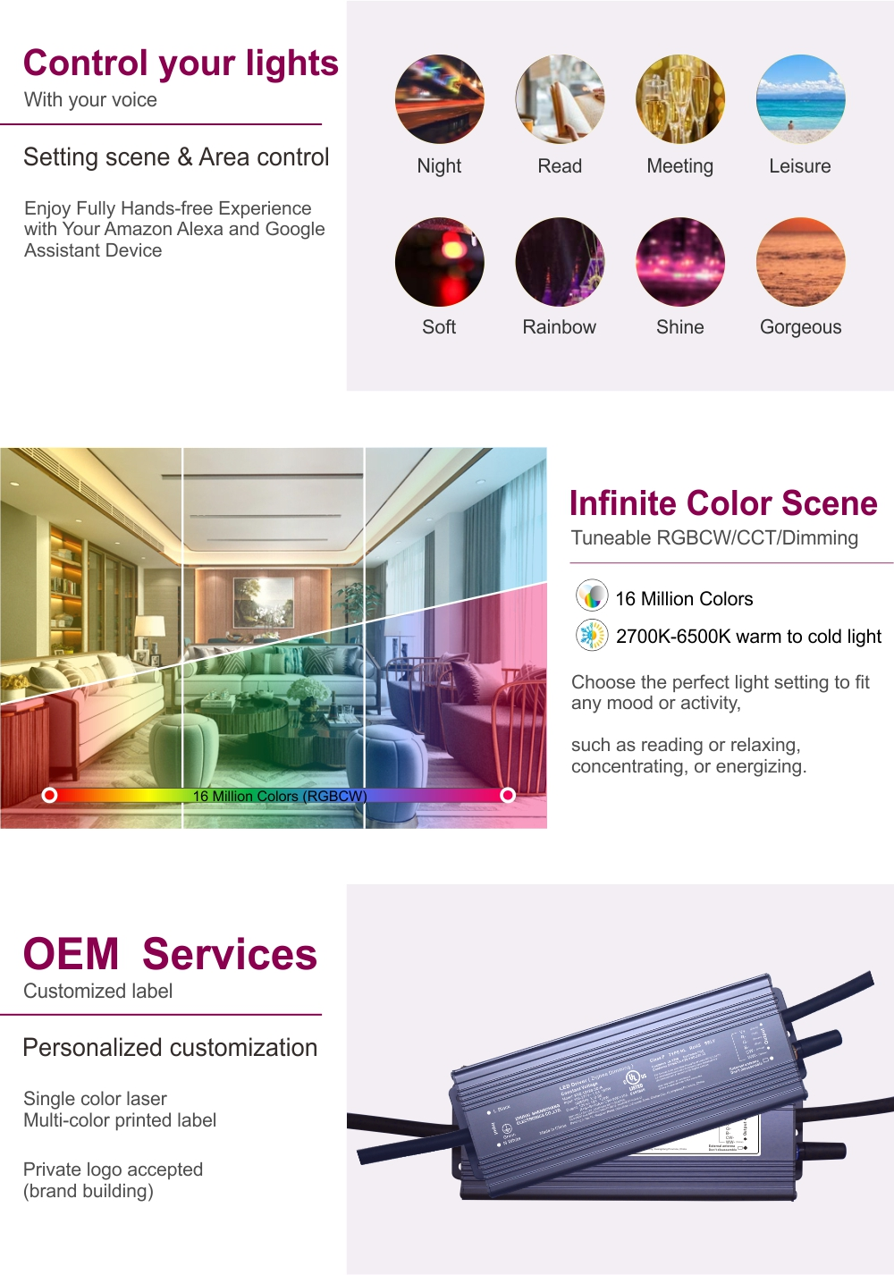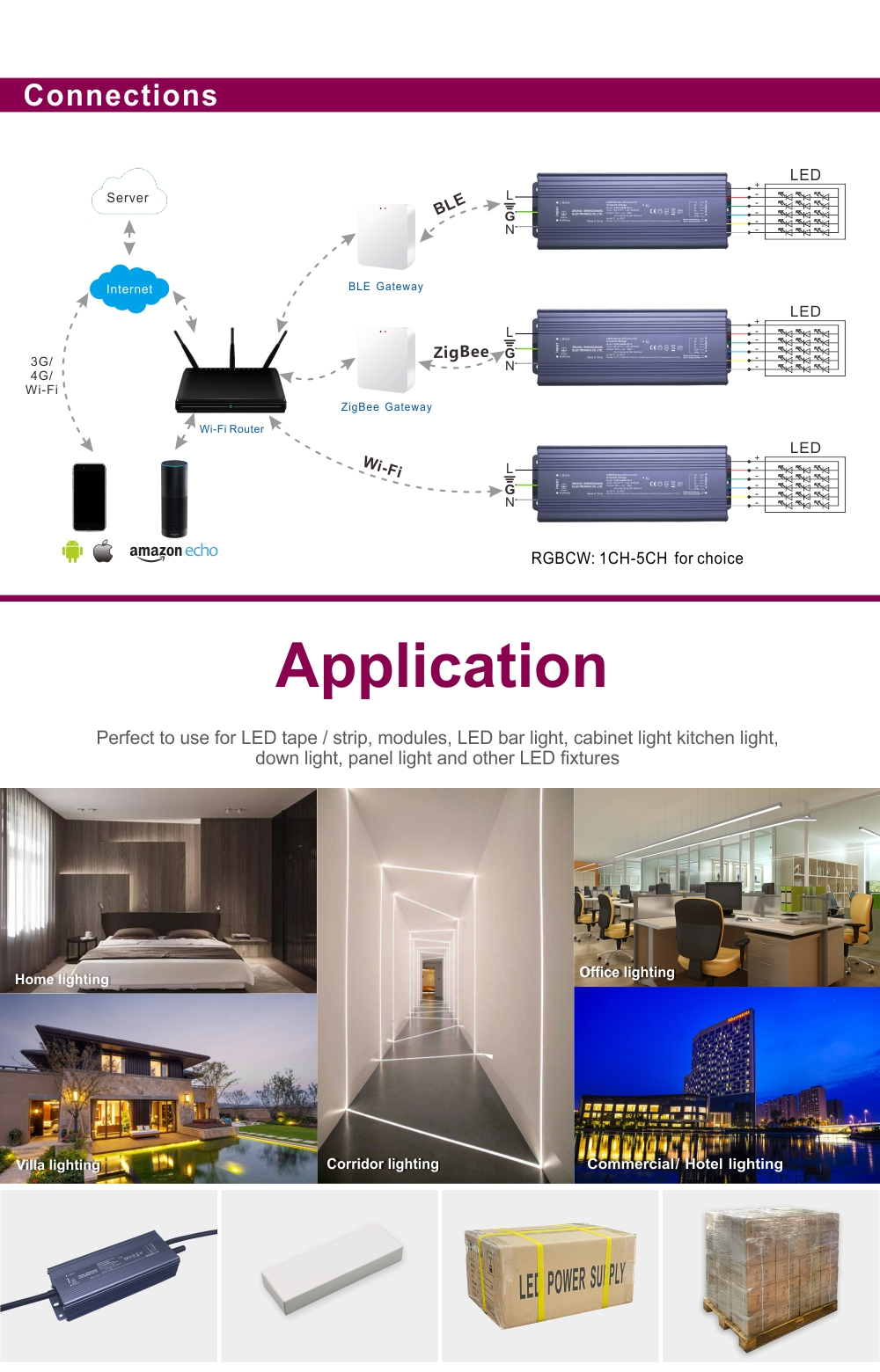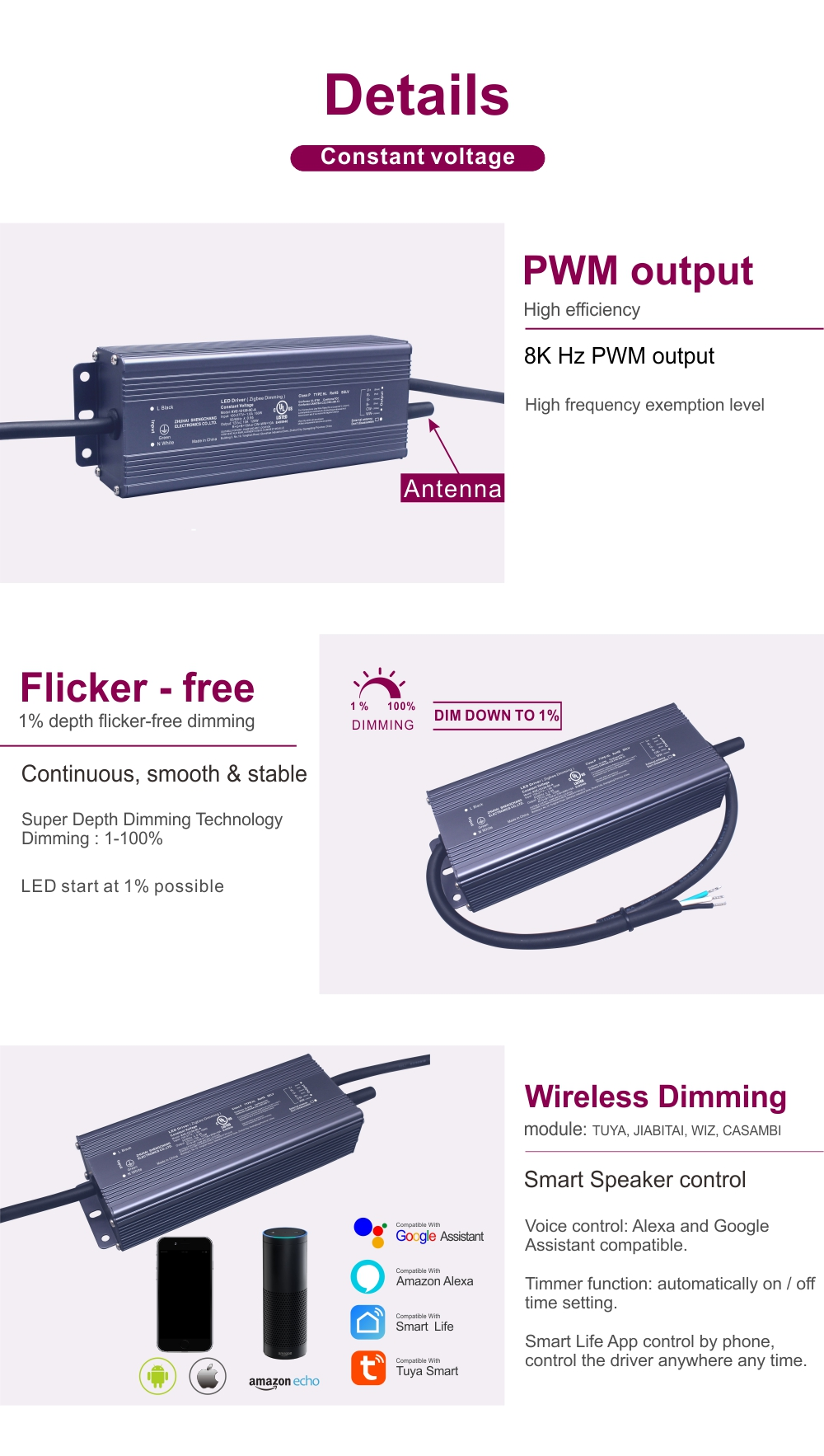 Tuya Smart ökosüsteemiga sügavalt integreeritud Tuya Zigbee juhtmeta hämardava konstantse pingega 120 W LED-draiver kasutab sujuvaks kahesuunaliseks suhtluseks uusimat Zigbee 3.0 sideprotokolli.